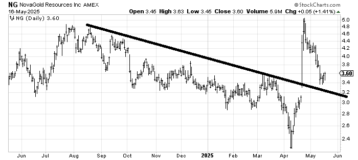 Novagold Resources NG has come all the way down to the top of support. I would have liked it to fill the gap or tag the line but this is the area to have another look at it on the long side.