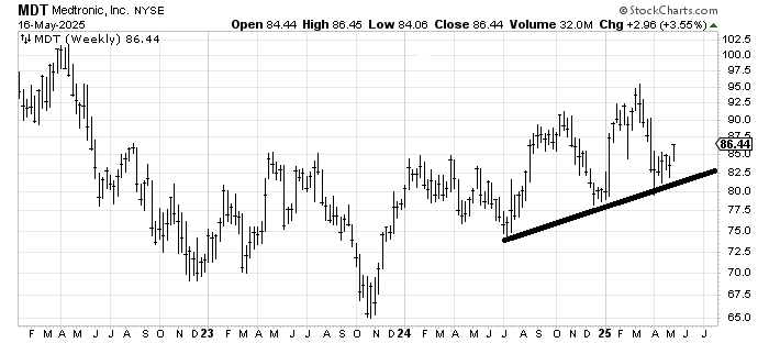 Now that I have warmed up to a drug stock again (Amgen AMGN) I thought we should revisit a chart we looked at a few months ago. This is Medtronic MDT and it’s a four-year chart. I liked it then (on a longer-term basis) because it had this base it was building. Notice it did not make a lower low in April (vs December).