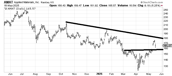 Applied Materials AMAT should bounce on a gap fill off $160 but there is a lot of resistance to chew through on the upside.