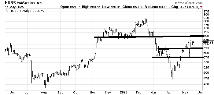 HubSpot HUBS is caught between support at $575-625 and $700, so if it comes down into support you’d buy and on a rally to $700 you’d sell.