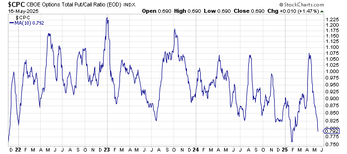 The 10-day moving average of the put/call ratio is now fractionally under 0.80 so it tells us folks are bullish. We had two days last week with the equity put/call ratio in the 40s, which also tells us the bulls are out.