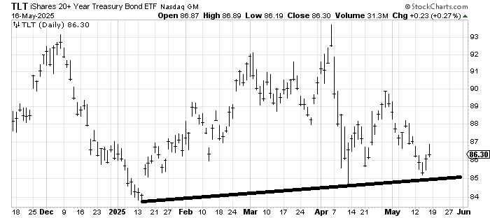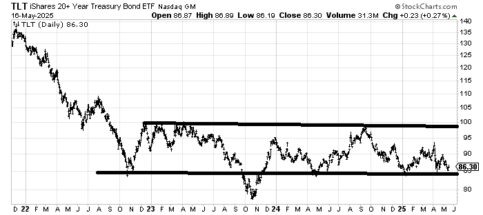Let’s look at the chart of TLT, but let’s take it back to 2022. What we see is TLT has been in a trading range for two and a half years now. Would a break of the lower line be meaningful? Yes. And no.