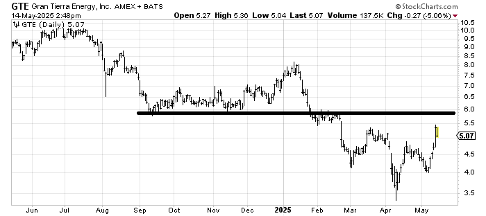 Gran Teirra Energy GTE is trying to build a base. The resistance at 5.50-6 is obvious. What is not obvious is where support is. If it can hold 5-ish, I’d be impressed.