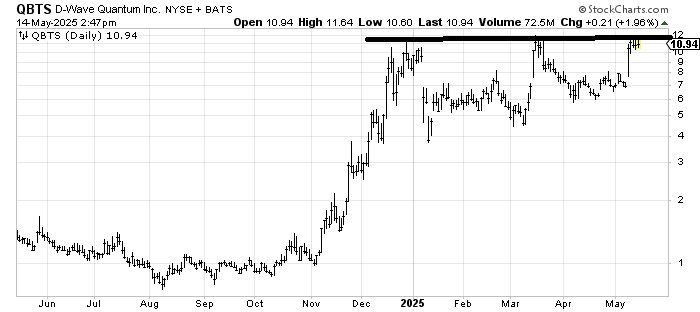 I am terrible at high bases. I am also terrible at buying stocks as we head into an intermediate-term overbought condition. That having been said, getting D-Wave Quantum QBTS over 12 would be a nice breakout. It trades thinly, so I’d use a stop under 10 because a pullback under there would probably mean another swoon to the low end of the range.