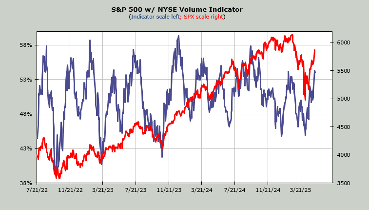 The Volume Indicator is at 54%. It too ought to be overbought next week.