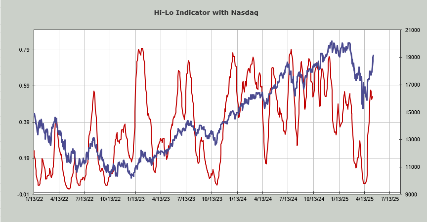 The new highs weren’t great again, but the new lows are mostly hovering where they have been (for Nasdaq in the 100-125 range). This means the Hi-Lo Indicator for Nasdaq hasn’t budged. It had that minor little tick up, but it has sat there ever since. A lower high next week, as we get intermediate-term overbought, would be a negative.
