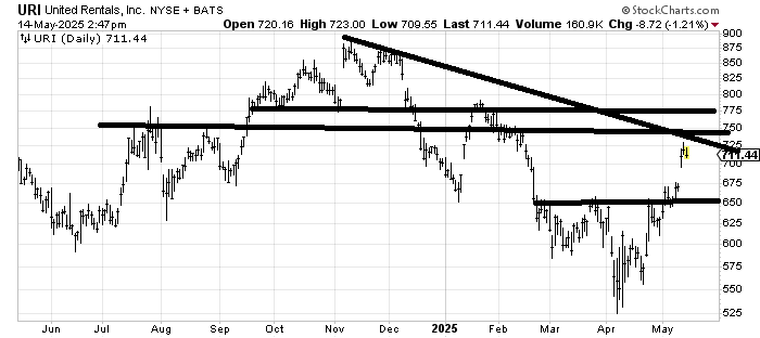 United Rentals URI has done what many stocks have done this week: gap up and sit there. I suspect there will be another attempt at pushing into that 750-775 resistance area. It would be better if it did it from 700 rather than the gap fill down at 675.