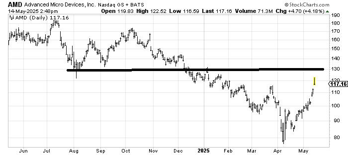 Advanced Micro Devices AMD will run into some serious resistance around 130, but it has had resistance all the way up, and that hasn’t stopped it from gapping up. The problem is the semis are very overbought now. If it falls back to the 110-112 area, I’d have another look at it.