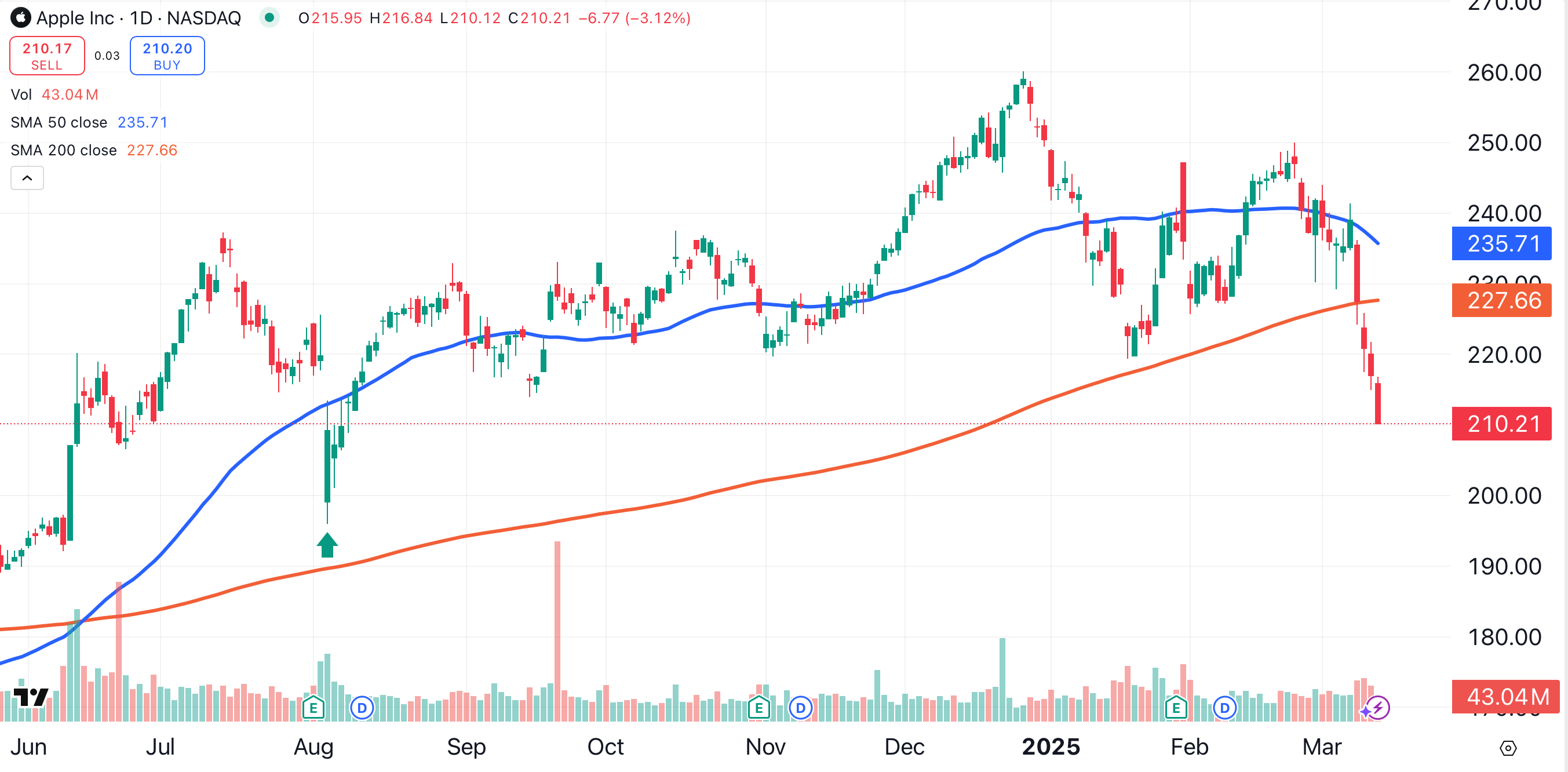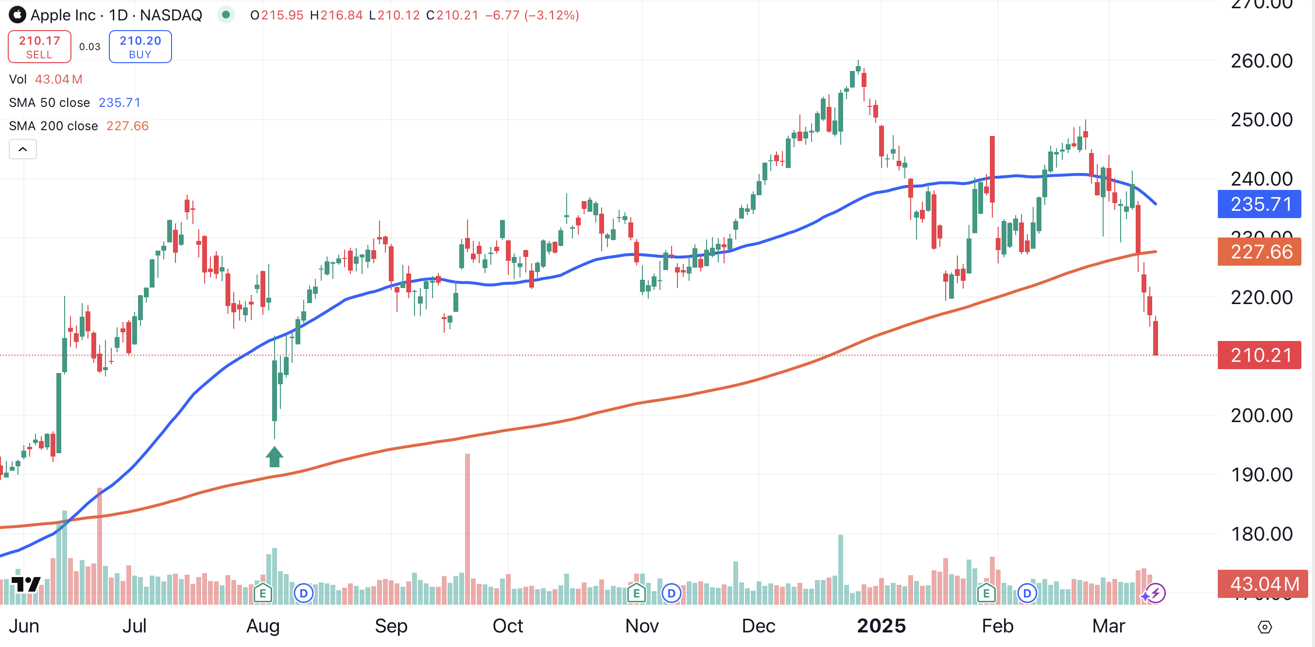 What's the right price to buy Apple? The stock caught a strong bid at $196 (green arrow) shortly after reporting earnings in August of last year. A buyer stepping in at $196 could buy Apple about 25% below its all-time high.