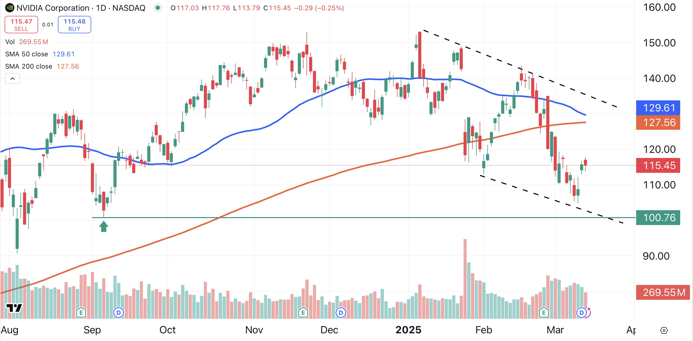 Nvidia is currently trapped in a bear channel (black dotted lines), with the low end of that channel projected at the $100 area. This is the same price area that saw the stock bounce after a selloff in September (green arrow).