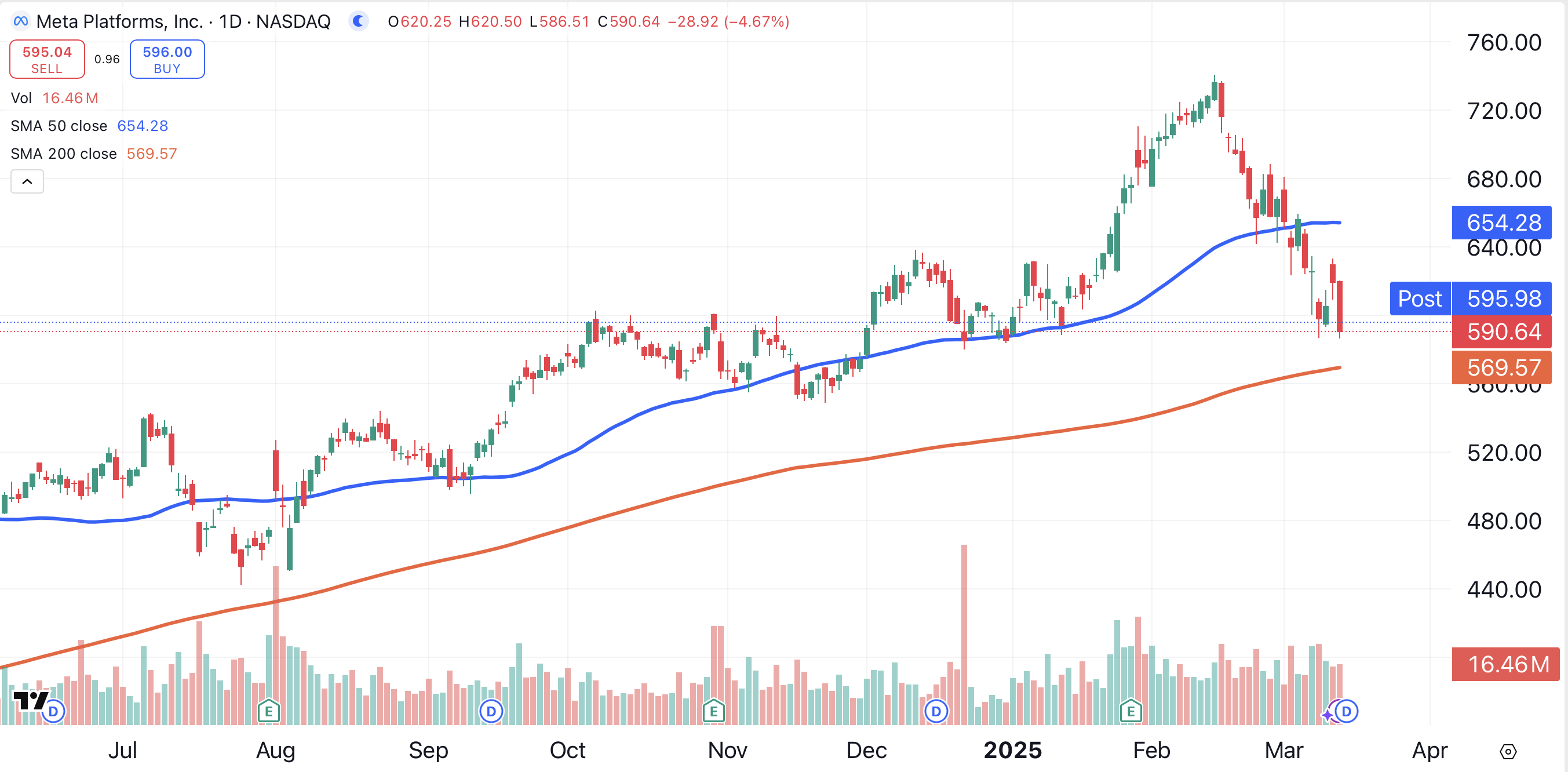 Where would I buy Meta Platforms? On a pullback to that same indicator, currently located at $569.