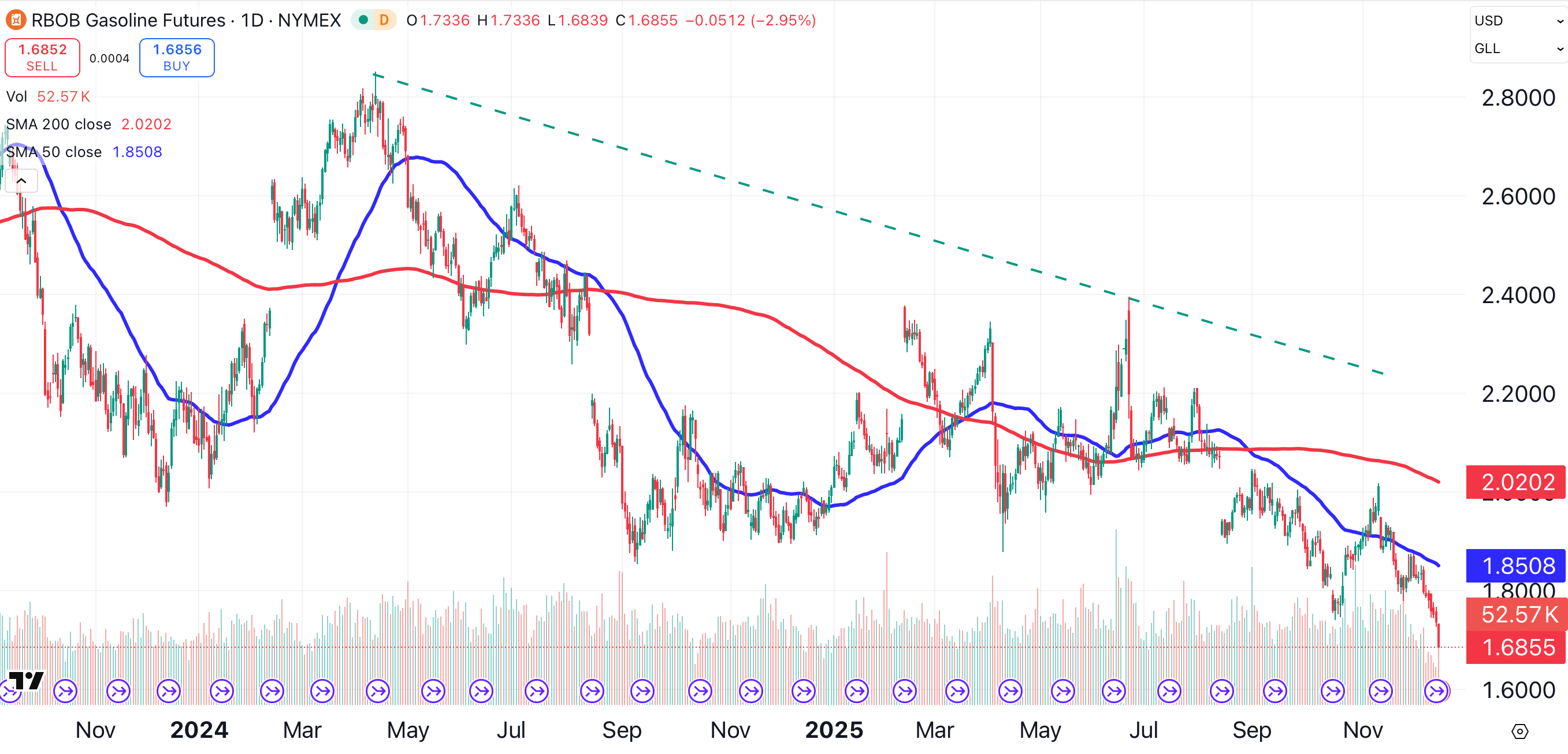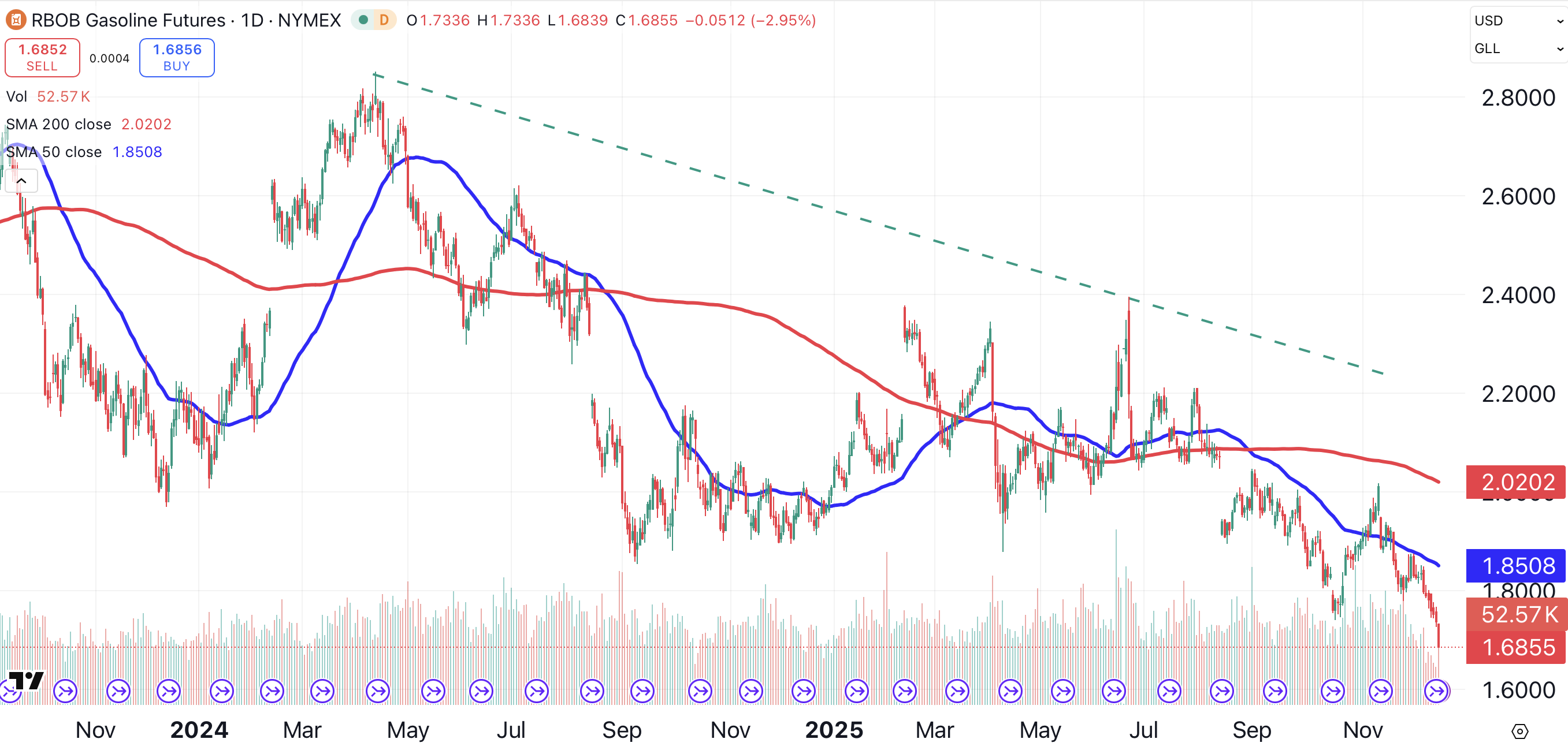 One driving factor is the low price of gasoline. As seen in the chart below, RBOB Gasoline futures have been steadily falling since the start of the year. Gasoline futures are now at a five-year low, and are trading at their lowest levels since the early days of the Covid-19 pandemic.