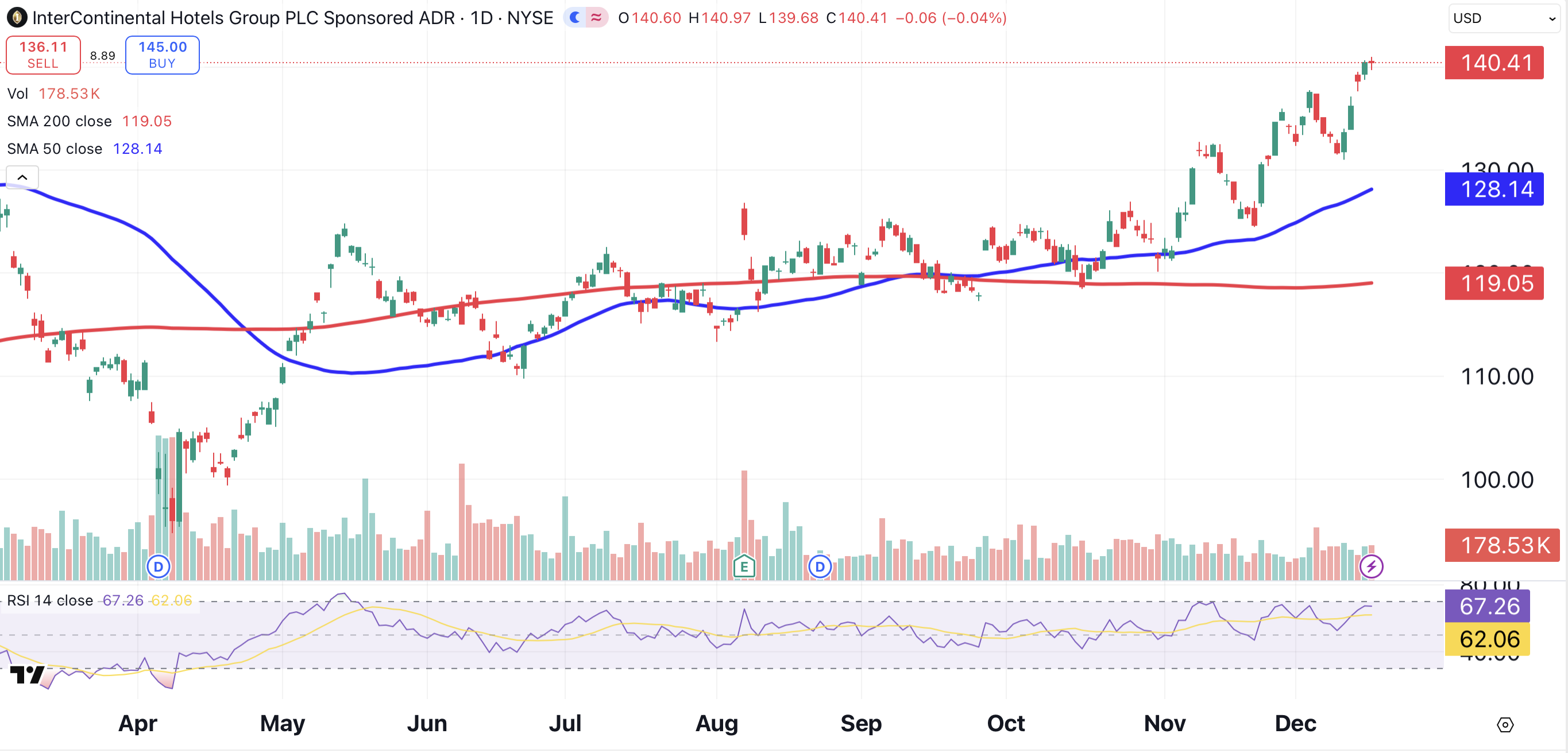 A series of higher lows and higher highs is visible on the hard right edge of the chart. IHG’s 50-day (blue) and 200-day (red) moving averages, which were flat for most of this year, are starting to climb.