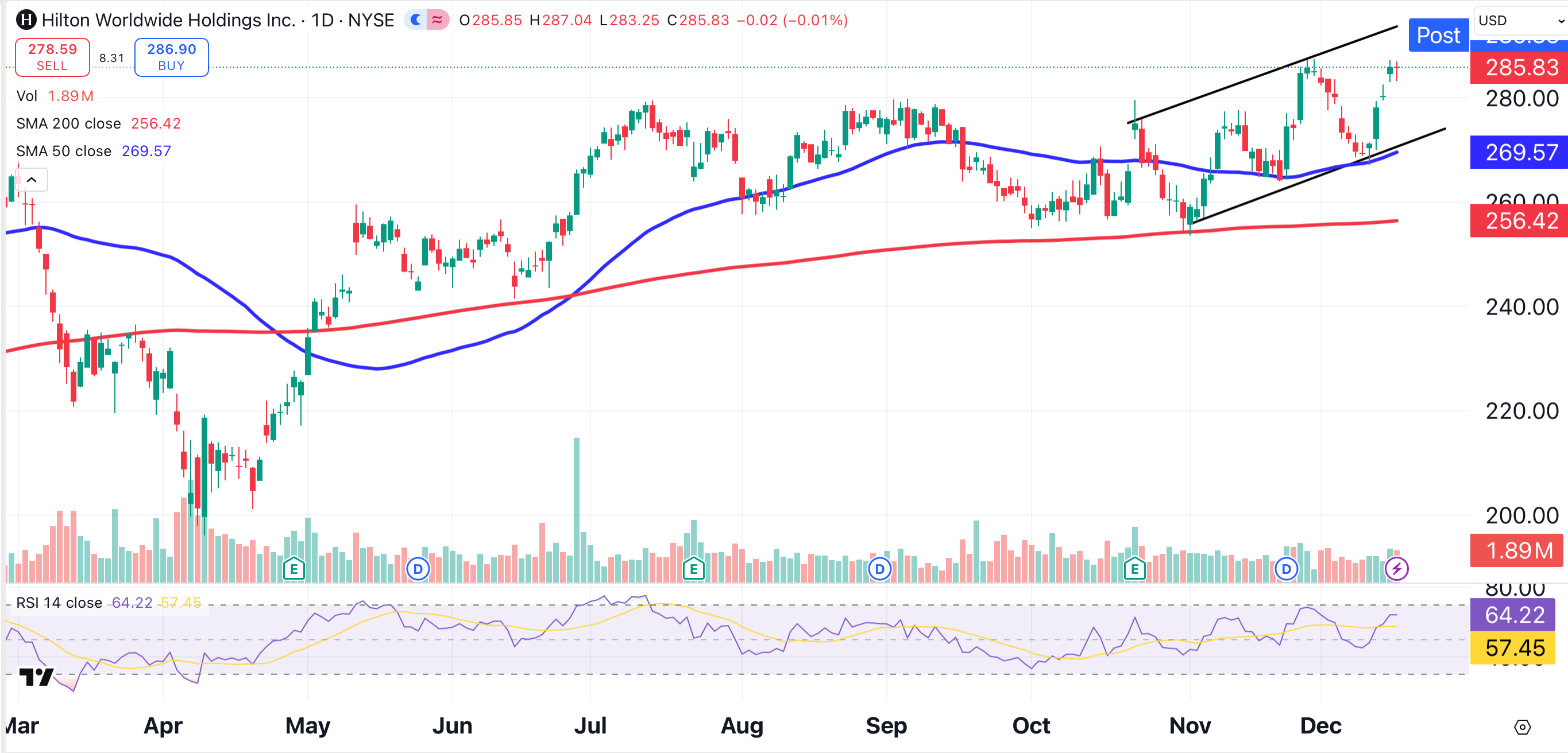 Hilton’s bull channel (black lines) is weaker than the trend on IHG’s chart, but the stock still managed to reach a new high.