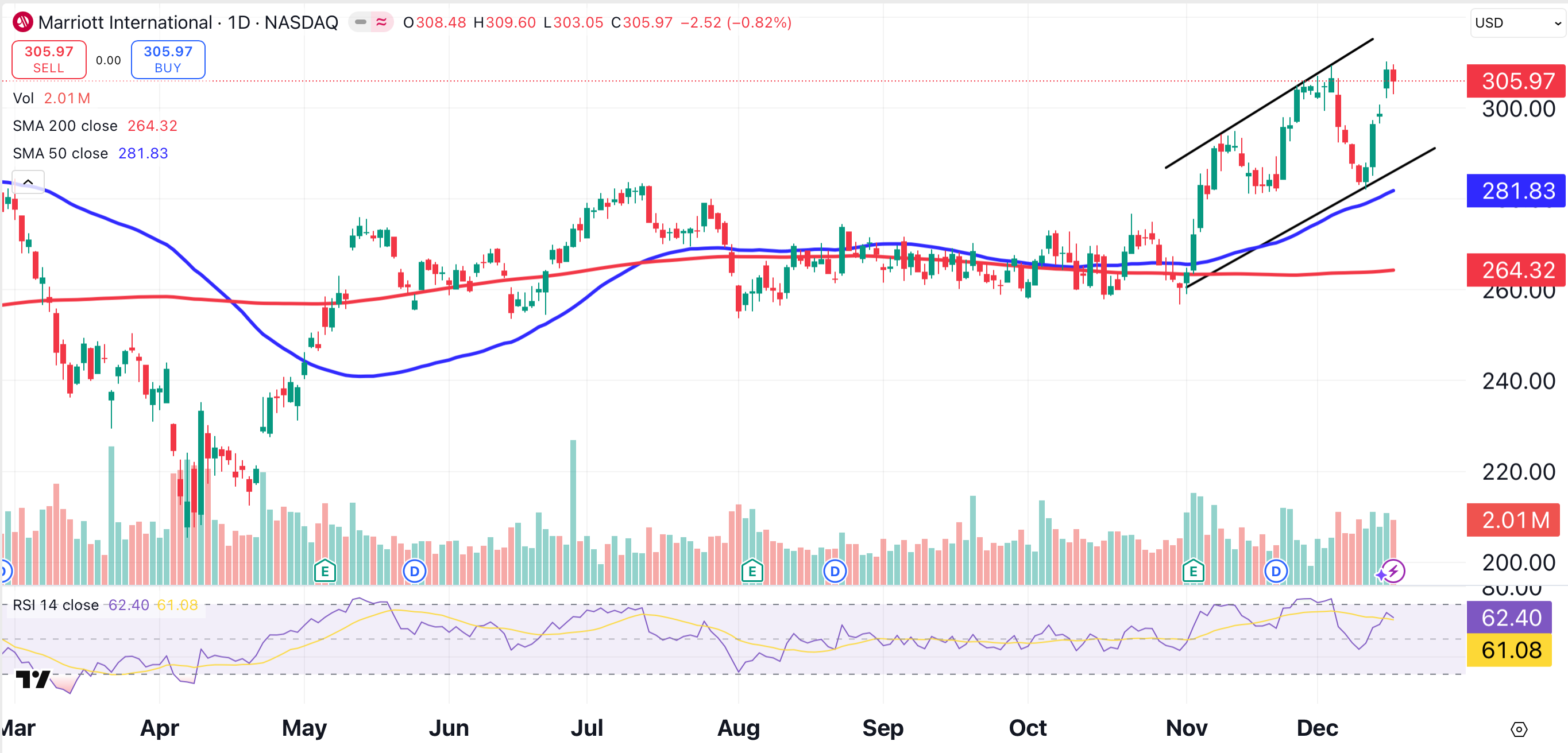 Marriott International (MAR) is also climbing within a bull channel (black lines). The Bethesda, Maryland-based hotelier boasts 9,000 locations and 1.7 million rooms, making it one of the largest companies of its kind.