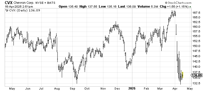 Chevron CVX was at a new high, and while it looked a bit tired up there and ought to have pulled back (toward 160), it chose to collapse. Unless/until it does some work, it’s pure guesswork. And that 5% yield is okay, not great. Let it prove it wants to hold the low 130s first.