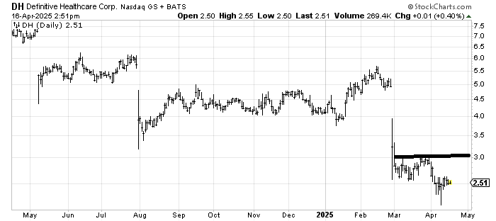 Definitive Healthcare DH has gapped down three times in the last year, so until it actually gaps up, it remains vulnerable to gaps down. A rally to 3-3.50 would be a good place to sell it.