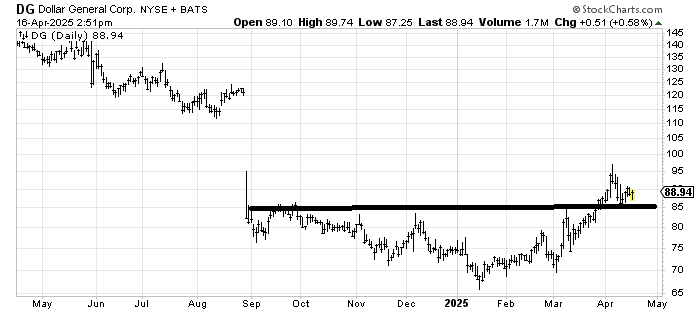Dollar General DG has moved up quite a bit since I recommended it in February. There is a measured target of around 100, and of course, the gap fill around 115. My inclination is to see if it can go sideways a while longer and stay over 85 before jumping in again and buying. In this market, if you want to buy it now, then use a stop under 85.