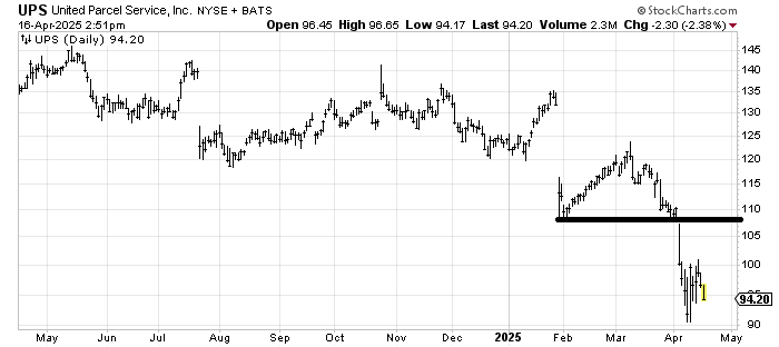 United Parcel Service UPS is a high dividend payer, but there is nothing remotely close to basing in that chart. There is not even a measured target that feels secure. I would, however, at least be willing to play this for a bounce if it can’t break 90 with any oomph on this leg down. But otherwise, I’d worry that it has a possible dividend cut in its future.