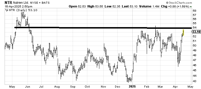 With the move in Nutrien NTR this week, the question of the day is, what is the target? I think it has short-term resistance at 54-ish, but the longer-term target is that old high area of 58-60.