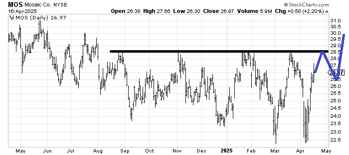 Down below you can see I was asked to revisit the chart of Nutrien NTR, which I had recommended months ago. However, I was also asked if Mosaic MOS fits the bill for a base. It’s working on it. It has a lot of resistance all the way up, so if –a big if—it can play out something like I have drawn in blue, then it would improve the chart greatly.