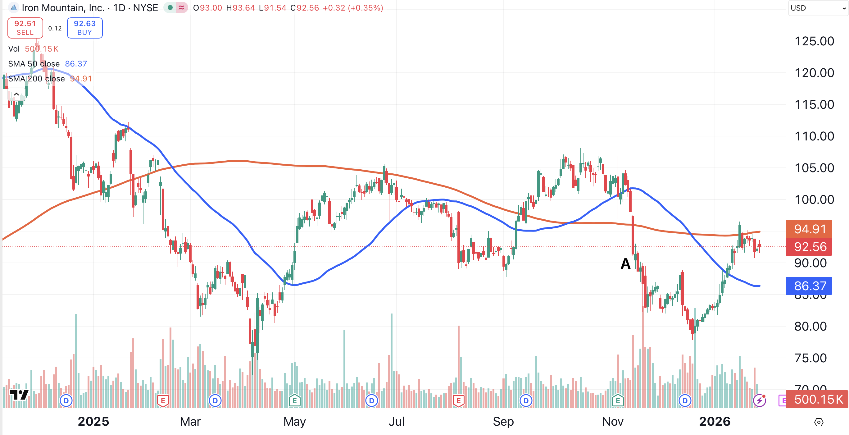 Two months ago (point A), Gotham focused on Iron Mountain (IRM) , on allegations of irregular accounting practices (point A). The Boston-based information technology company initially sold off, but has rebounded over the past month. There has been no proof of wrongdoing on Iron Mountain's part.