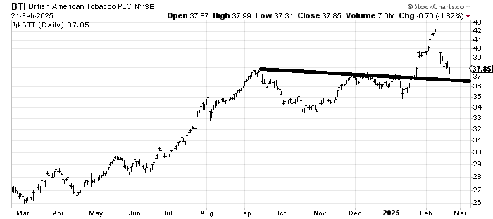 British American Tobacco BTI has some support here and has filled the gap and heck, it has to be oversold. I’d be shocked if there wasn’t a bounce in the next few days. Then, we can assess the damage.