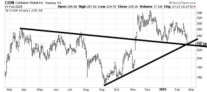 Gosh, did I blow it on Coinbase COIN. It has literally been nothing but down since those earnings. It is, however, getting oversold and should bounce. But now it has left all that resistance overhead. Yet what I find so curious is that Bitcoin has not broken 90k.