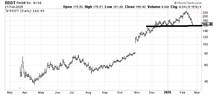 Reddit RDDT is getting short-term oversold in this mid-160s area. A bounce that fails to get over 180 would set up a possible break of this support the next trip down. A lot of these highfliers could be setting up head and shoulders tops like the Amazon chart above. That’s what we watch for.