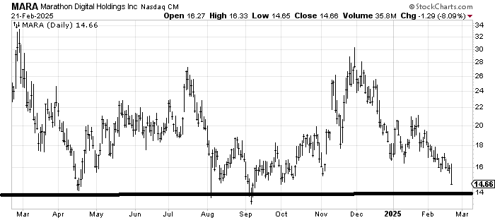 Marathon Digital MARA is similar to ITB (the Homies) in that it has come all the way down to a critical level. My guess is there is a bounce from that 13-14 area, but I’m not confident the bounce will be very good.
