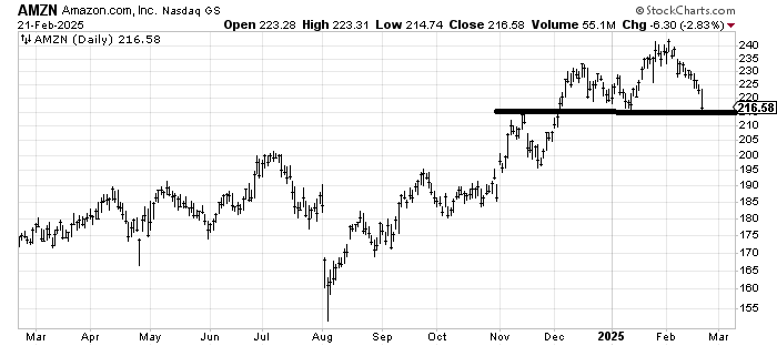 We looked at Amazon AMZN last week, and I said I thought it was coming down to the 215 level. It is almost there. Should it bounce off there and fail to get over 225-230 it will look like a head and shoulders top (I drew that in when we looked at it). These are the things we should be watching.