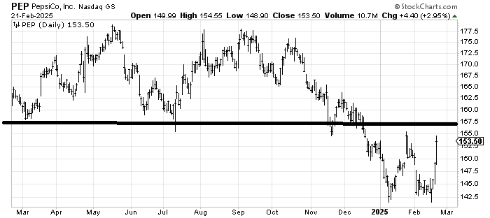 When I recommended Pepsi PEP a week or so ago in that 143 area, I did not expect it to surge as if it was a small-cap technology stock, but it has. Just a reminder that there is quite a bit of resistance in that 155-160 area. Traders might want to take a little bit off the table here.
