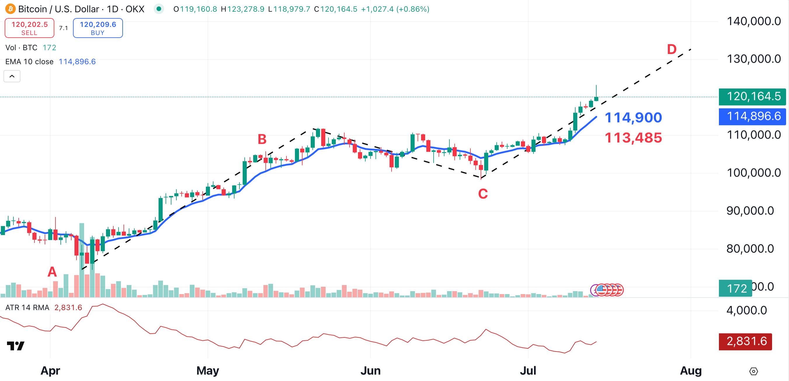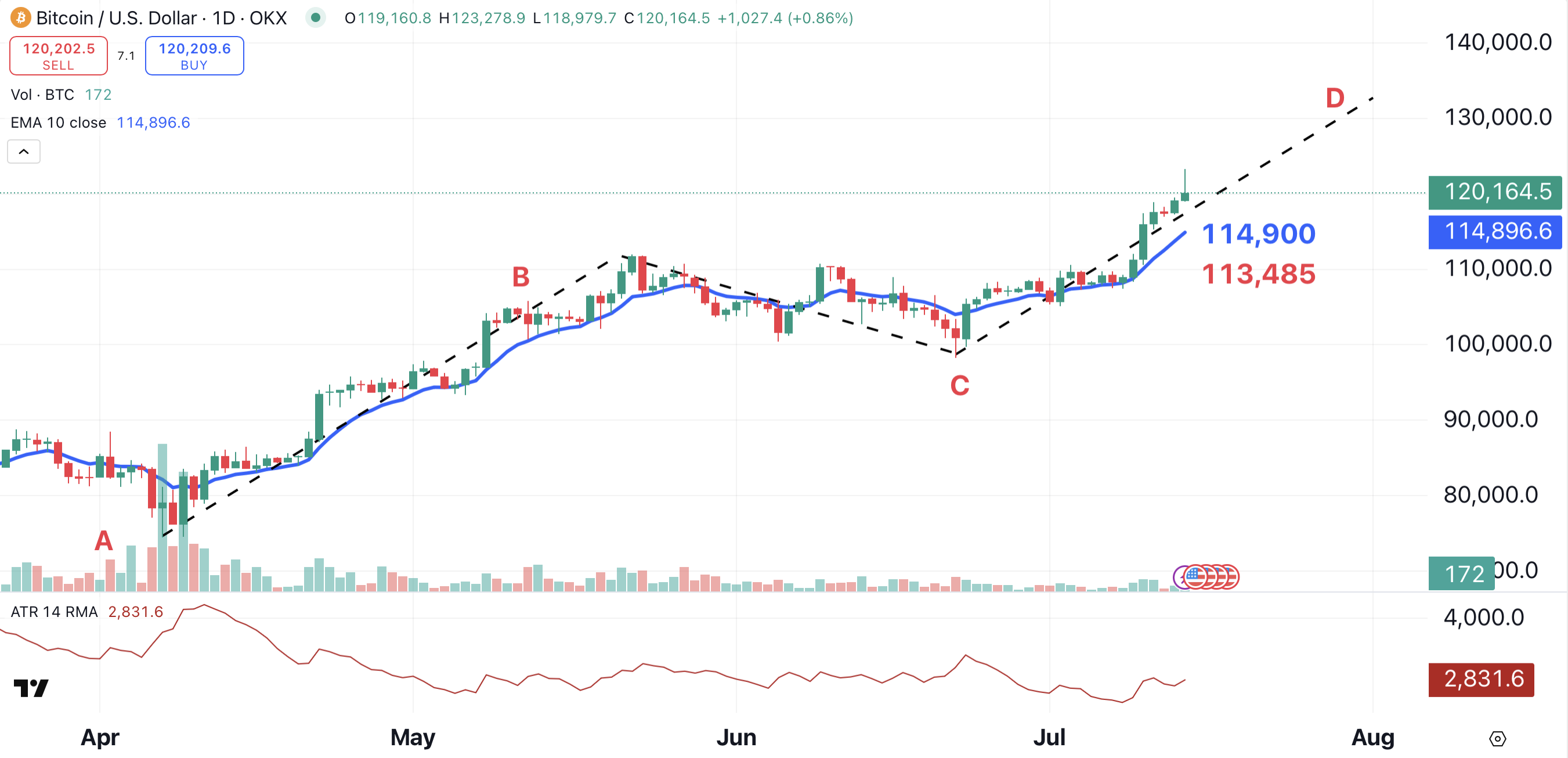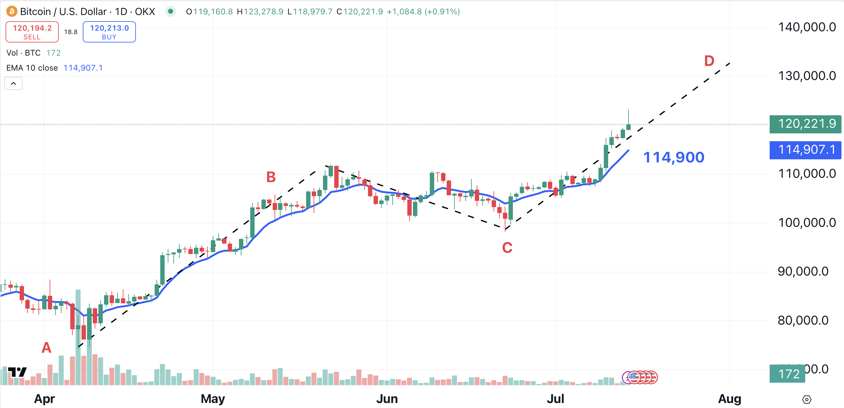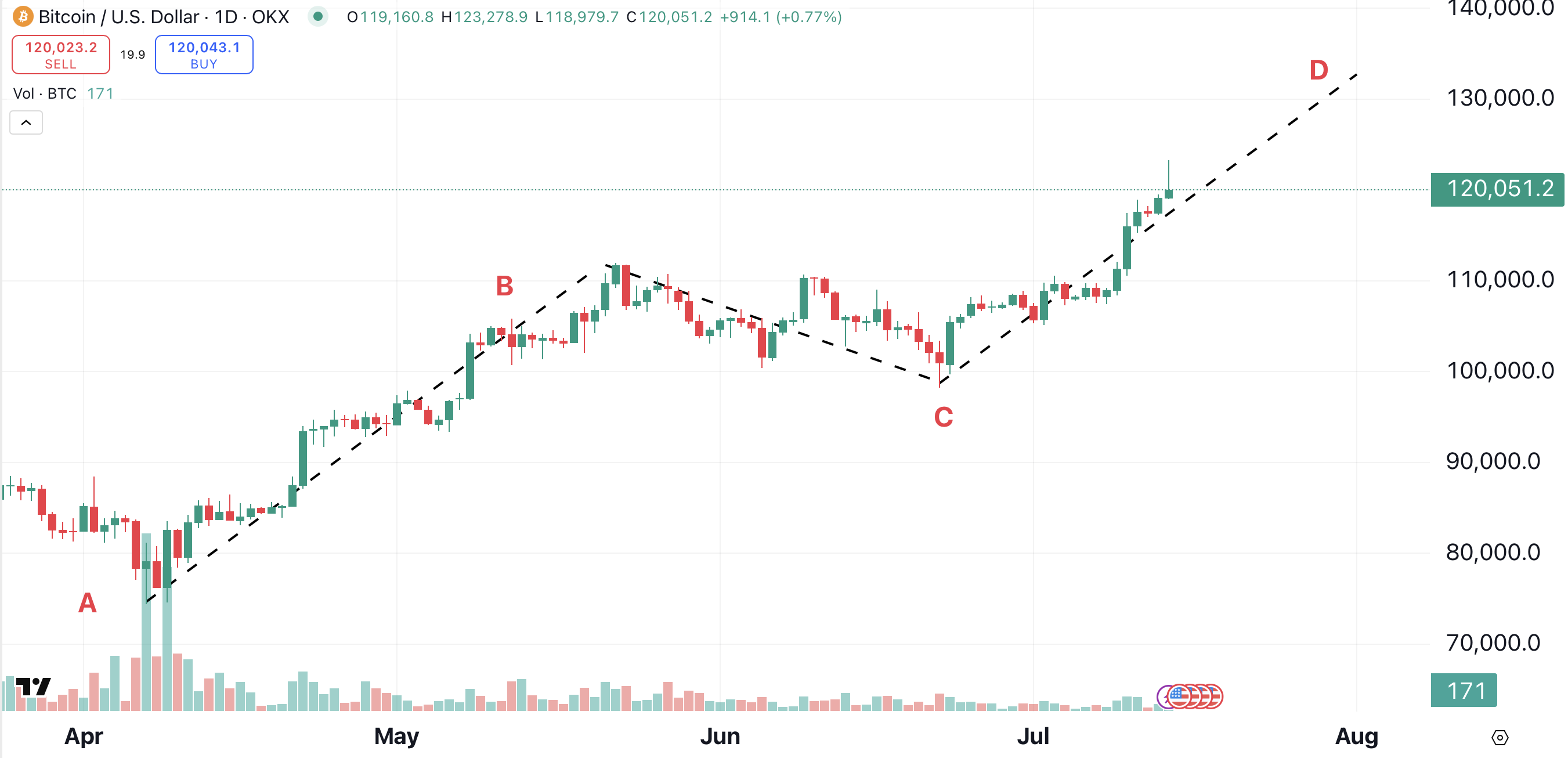 Bitcoin recently formed an A-B-C-D pattern. This old-school pattern, which began to form in April, projects bitcoin to the $133,000 area (point D). According to the chart, bitcoin could reach that level within a month.