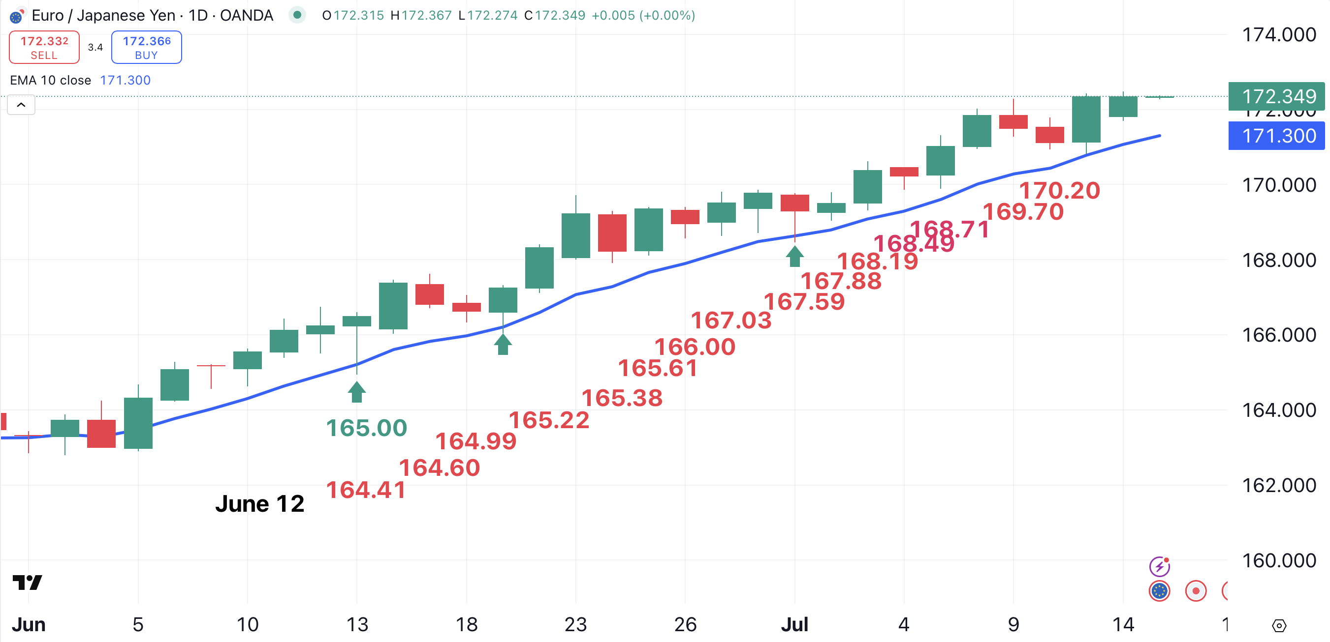 Here’s an example: a recent currency setup using the euro/Japanese yen currency pair. Note how the stop continues to rise (red numbers) as the exchange rate maintains its position above the 10-EMA (blue).